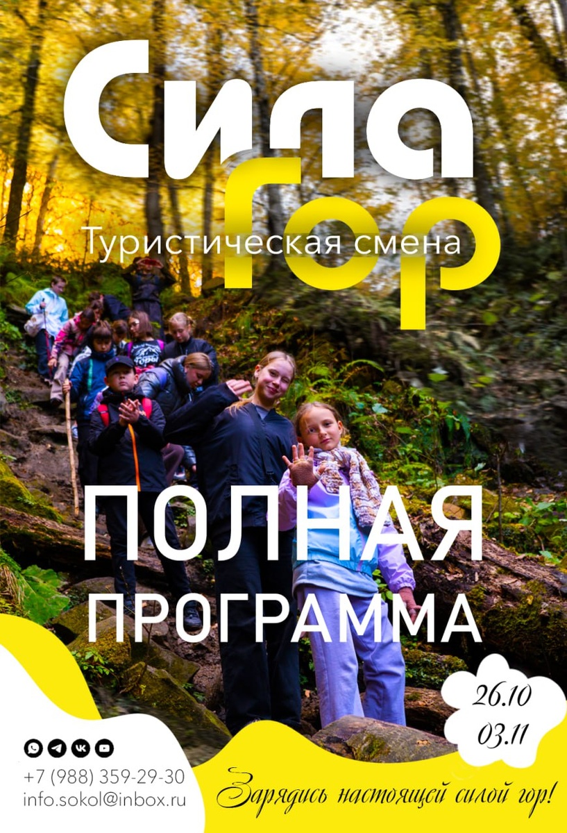 🤩 Сила гор Кавказа 🤩 Программа смены Тур для тех, кто ищет настоящие приключения и уют 🤩 Даты: 26 октября – 3 ноября 🤩 Где: Мостовский район, Краснодарский край 🤩 Для кого: родители и дети 6-17 лет 🍃 Добро пожаловать в путешествие, где сливаются воедино золотая осень гор🌄, шум водопадов, вкусный чай ☕️ у костра 🔥 и душевная компания. Мы подготовили для вас 9️⃣ дней, наполненных красотой, активностью и отдыхом в одном из самых живописных уголков России. Программа по дням 👍 🔺 26.10 (ВС) – 🌸 День заезда и знакомства · Заселение в уютные номера · Знакомство с группой и гидами. · Приветственный ужин 🔺 27.10 (ПН) – ❤️ Обживаемся и заряжаемся · Утро: Неспешная прогулка по окрестностям, знакомство с природой и легендами места. · День: Активный туризм и игры на командообразование на свежем воздухе. · Вечер: Уютный концерт. 🔺 28.10 (ВТ) –🌄 День озерных зеркал и высоты · Полдня: Путешествие к урочищу Ахмет-Скала. · Круглое озеро: Загадочный водоём почти идеальной формы, ок