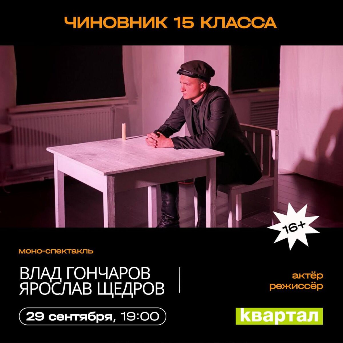ДРаматическая Антреприза Молодых (ДРАМ) и Гимназия № 2 представляют: МОНОСПЕКТАКЛЬ ВЛАДА ГОНЧАРОВА "ЧИНОВНИК 15 КЛАССА" (по мотивам романа И. А. Гончарова "Обрыв") | 16+ 🗓️ 29 сентября, 19.00 📍Квартал, Ленина 78 В романе Гончарова про Татьяну Марковну Бережкову, её внучек и племянника человеку нового времени Марку Волохову уделяется ровно столько внимания, чтобы раскрыть черты неблагонамеренного выразителя революционных крайностей. В новом спектакле на первый план выходят чувства Волохова его мятущаяся душа, полная лирических переживаний. Его нравственное биполярное расстройство, которое и приводит молодого, умного и честного человека к краю Обрыва… 🏷️ свободные взносы #29сентября25