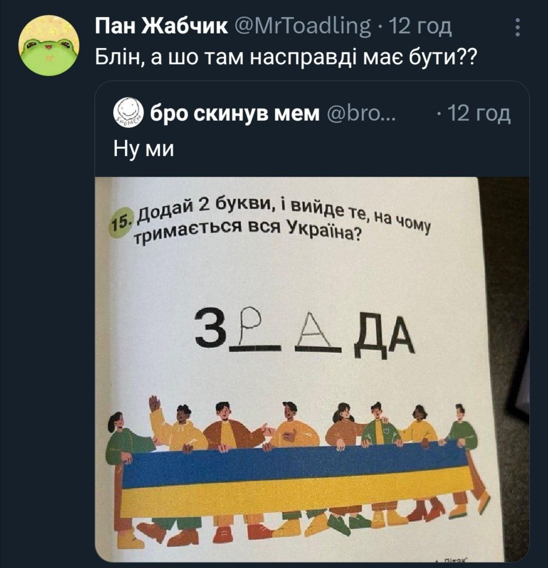 «На чем держится вся Украина?» По другому и не скажешь. P.S. В оригинале задумывалась "згода", т.е. согласие. Конечно, тоже полностью подходит: все "несогласные" либо сбежали, либо в тюрьме. Подпишись на Телеграм Александр Семченко