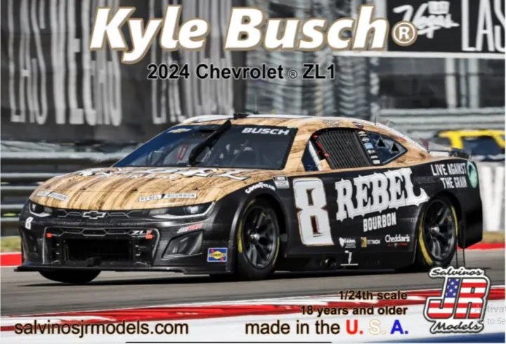Американская Salvinos JR Models выпустила с новой декалью свою модель гоночного автомобиля разработки 2022 года Chevrolet Camaro ZL1 в масштабе 1/24: Kyle Busch 2025 Chevrolet Camaro ZL1 Rebel Burbon (каталожный номер RCC2025KBA)