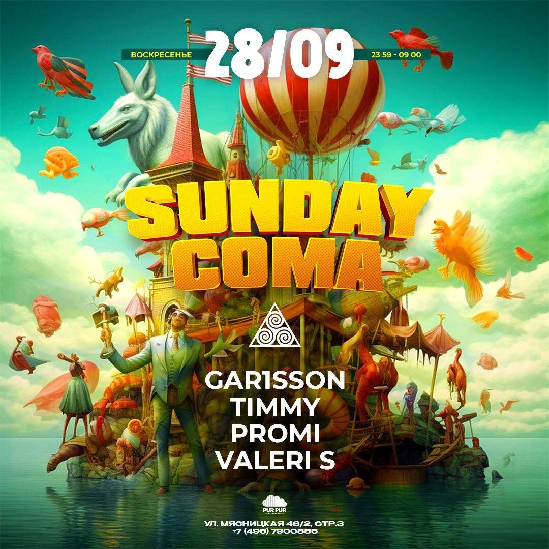 ▲ 28/09 - SUNDAY COMA В то время, когда обычно заканчиваются вечеринки и начинается рабочая неделя…когда внезапное желание танцев становится выше скучных условностей…для тех, кто понимает, о чем идет речь… - начнется самая душевная тусовка в ночь с воскресенья на понедельник вместе с Sunday Coma! «Вы что, психи?» «Да, и нас таких целый танцпол!» Музыку в ночь с 28е на 29е сентября с собой привезут: 🥁 GAR1SSON 🎺 TIMMY 🪗 PROMI VALERI S ТГ канал @SundayMusicComa 🎫 Вход свободный Info & Reserve: +74957900885 FC / DC 📆 28 сентября, 23:59—9:00 📍PUR PUR iBAR , Москва, Ул. Мясницкая 46/2стр3