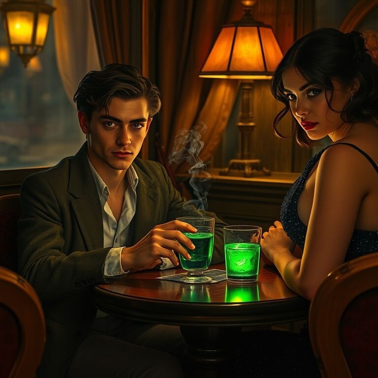 Марсель развалился на своём привычном месте у сцены, словно трон в дымном королевстве кабаре. На столике перед ним тонкий бокал абсента, светящийся призрачным изумрудом в полумраке. Он медленно вращает в пальцах ложечку с сахаром, наблюдая, как капли холодной воды падают в зелёную глубину и размывают жидкость до туманного молока. Джаз лениво льётся из саксофона, а публика гудит, но Марсель, прикрыв глаза, будто слушает ритм только своего сердца.
