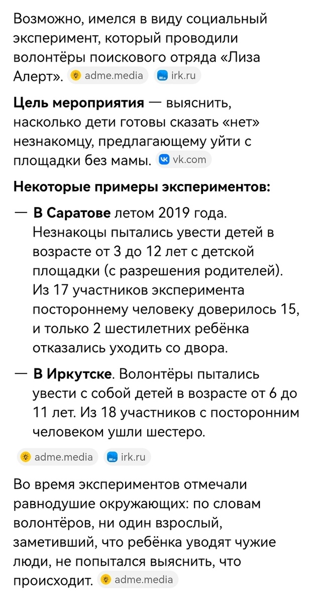 Читаю пятилетней дочке две книги Л. Петрановской ЧТО ДЕЛАТЬ, ЕСЛИ... Отрабатываем по ролям ситуации, в том числе, как вести себя с незнакомцами. Всё разобрали, моя душа спокойна, я в своём ребёнке уверена! Через какое-то время идём на большой городской каток. Мы все в семье неплохо катаемся + дочь несколько месяцев ходила на фигурное катание, база есть. На катке благотворительный праздник, все деньги за вход пойдут в детский фонд, а чтобы привлечь народ, школа фигурного катания проводит мастер классы. Я прибилась к взрослой группе. Дочь укатила к детской, но ей там стало скучно. Я кренделя кручу, за дочкой поглядываю. Смотрю, она уже катается с мужиком и девочкой постарше. Мило общаются - папа с дочкой и моя за компанию. И тут мужик у девочки спрашивает - как тебя зовут? Та - Маша. У моей спросил. Ответила. Я насторожилась - аха, не отец. Мужик учит - шипы втыкайте в лёд, второй ногой катитесь - аха, не умеет кататься, и коньки с прокатным номером. Потом он давай их крутить-кружить, за ручки катать, они его тоже катают-толкают, в сугробы все падают, смеются. Мне совсем не смешно, веду наблюдение. Говорю своему преподавателю - вам не кажется, что что-то странное происходит? Девочки и этот активный мужчина незнакомы. Она - он точно не из нашей школы. Я переместилась к ним поближе. Набесились они, мужик берет этих веселушек за ручки и катит к выходу. Маша свою руку из его руки вырвала, варежка у него осталась, её держит резинка. Тут Маша каааак дёрнется, думаю, молодец, просекла ситуацию. Мужик её отпустил, она к родителям скорее укатила. Моя дочка за все время на меня ни разу не посмотрела, не обернулась, а сейчас он уводит её, как загипнотизированную, безвольную. Я всё ещё надеюсь, что отработанный урок про незнакомцев у неё в голове всплывет... Но нет. Так мы приехали к выходу. Там охрана, организаторы стоят. Я кричу ему - мужчина, вы чужого ребёночка прихватили. Он заметался - я... чё... она одна была... потерялась... Бросил её руку, побежал. А на выходе лёд изрезанный, рыхлый, он бежит по этой ледяной каше, падает, кое-как поднимается, снова бежит. Охранники не поняли, что произошло, а я так распсиховалась, до трясучки, говорить не могла, скорее домой ушли. Сейчас очень-очень жалею, что растерялась, не смогла собраться, не дожала его. У дочки спрашиваю - ты поняла, что на катке произошло? А что произошло? Тебя незнакомец украл. Нееее, мы просто катались, было весело. Конечно, весело, именно так это и происходит, милая. И она начала плакать от страха, когда дошло. Я всем взрослым в семье рассказала, сказала - этого ребёнка из поля зрения не выпускать! Добавлю после чтения комментариев. Для тех, кто знает, как правильно себя вести в теории, и что их ребёнок не уйдёт с незнакомцем - эксперимент Лиза Алерт. Подобных экспериментов много. Абсолютно все родители говорили, что ребёнок знает о безопасности и его не заманить. Неужели вы не видели эти ролики? Шок этих родителей, когда за несколько минут "похищали" их ребёнка. Ребёнок даже не взглянул в их сторону. Просто уходил. Насколько вы уверены в своём ребенке? Я в своей уверена - уйдёт. Живу с этим знанием. Надо быть сильным и смелым, чтобы сказать себе правду - да, у меня такой ребёнок. И да, я так реагирую на стресс - срочно выдернуть себя из страшной ситуации.