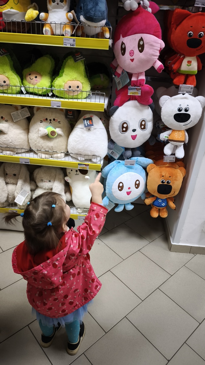 Первым делом нас, как магнитом, потянуло к отделу с мягкими игрушками. Это было похоже на встречу со старыми друзьями: классические мишки, котики-подушки, герои любимых мультфильмов «Малышарики». Груша их с удовольствием трогала, называла.