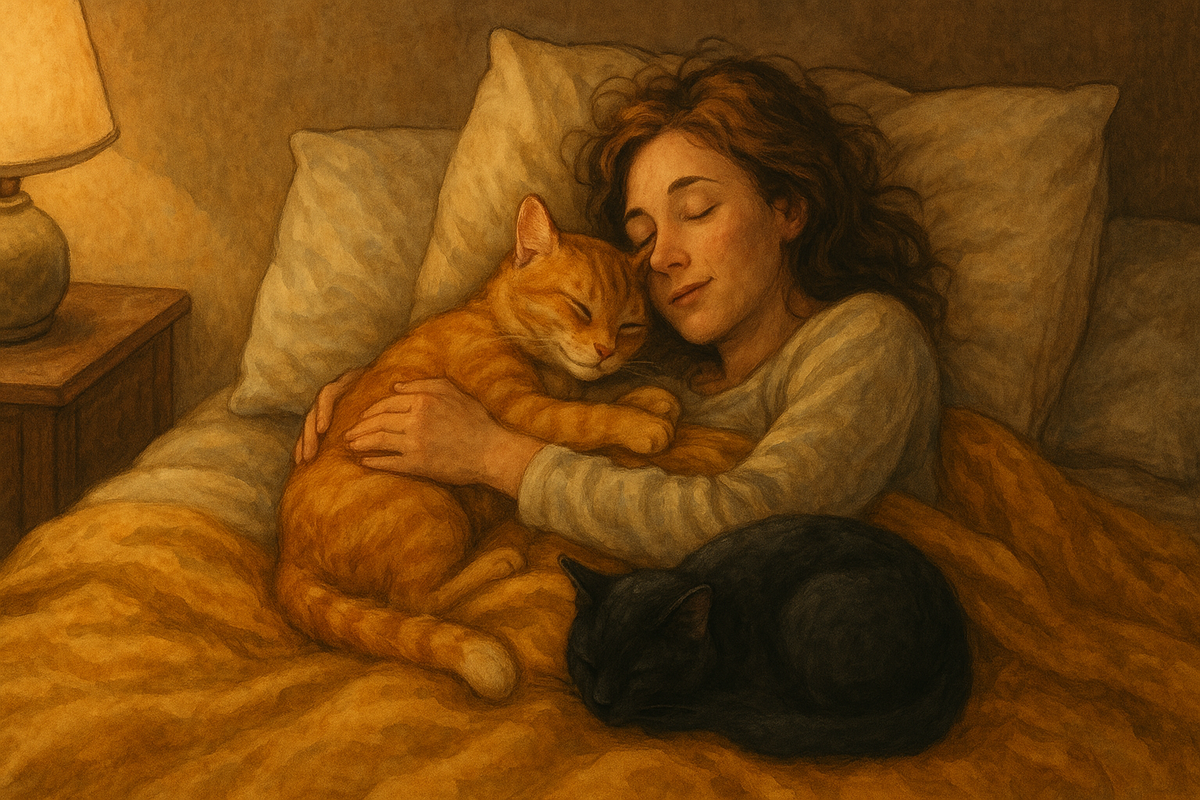 Нейропсихологическая байка с эстетикой внутренней улыбки Сегодня наткнулась на пост: «животные берут на себя наши болезни». Сижу, читаю и невольно улыбаюсь. Со мной рядом Персик, спит головой на подушке, обнимается, как человек. В ногах Кляксик, наш надёжный «якорь» у стоп. Дом ровно дышит. Хочется сказать честно и по-доброму. Животные не берут на себя болезни мистически. Они настраиваются на нас. Это ощущается как «взял мою боль», потому что работает сразу несколько очень земных механизмов. Как это выглядит по-научному, но по-человечески.