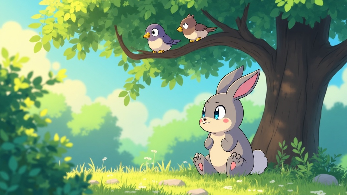 В зелёном лесу, у самой горы, жил маленький зайчонок по имени Попрыгунчик. Он был добрый, но очень-очень трусливый: пугался каждого шороха и треска. Однажды он прятался под ёлкой и услышал разговор двух птиц-дроздов: — Слышал, брат, про волшебное дерево с золотыми яблочками?