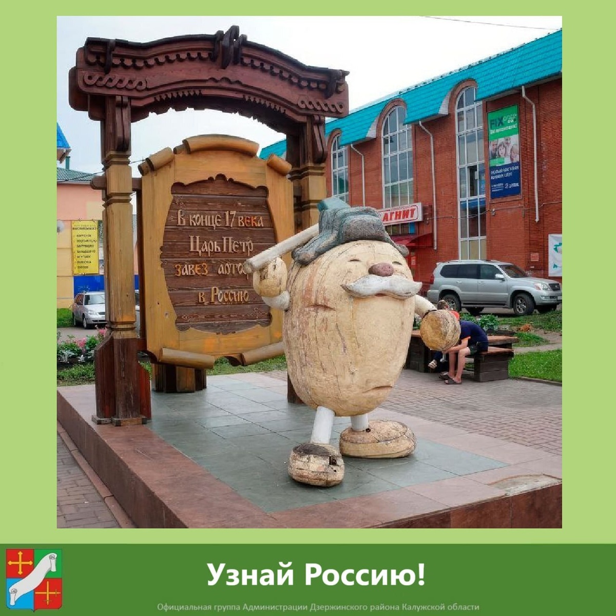 В память об этом достижении, а также о завезшем на Русь диковинку Петре I, на улице Мариинска появился симпатичный лубочный клубень-мужичок в лаптях и ушанке набекрень. Он лукаво улыбается в пышные усы и держит на плече лопату. Деревянная скульптура с любовью выполнена местным берестянщиком Юрием Михайловым.