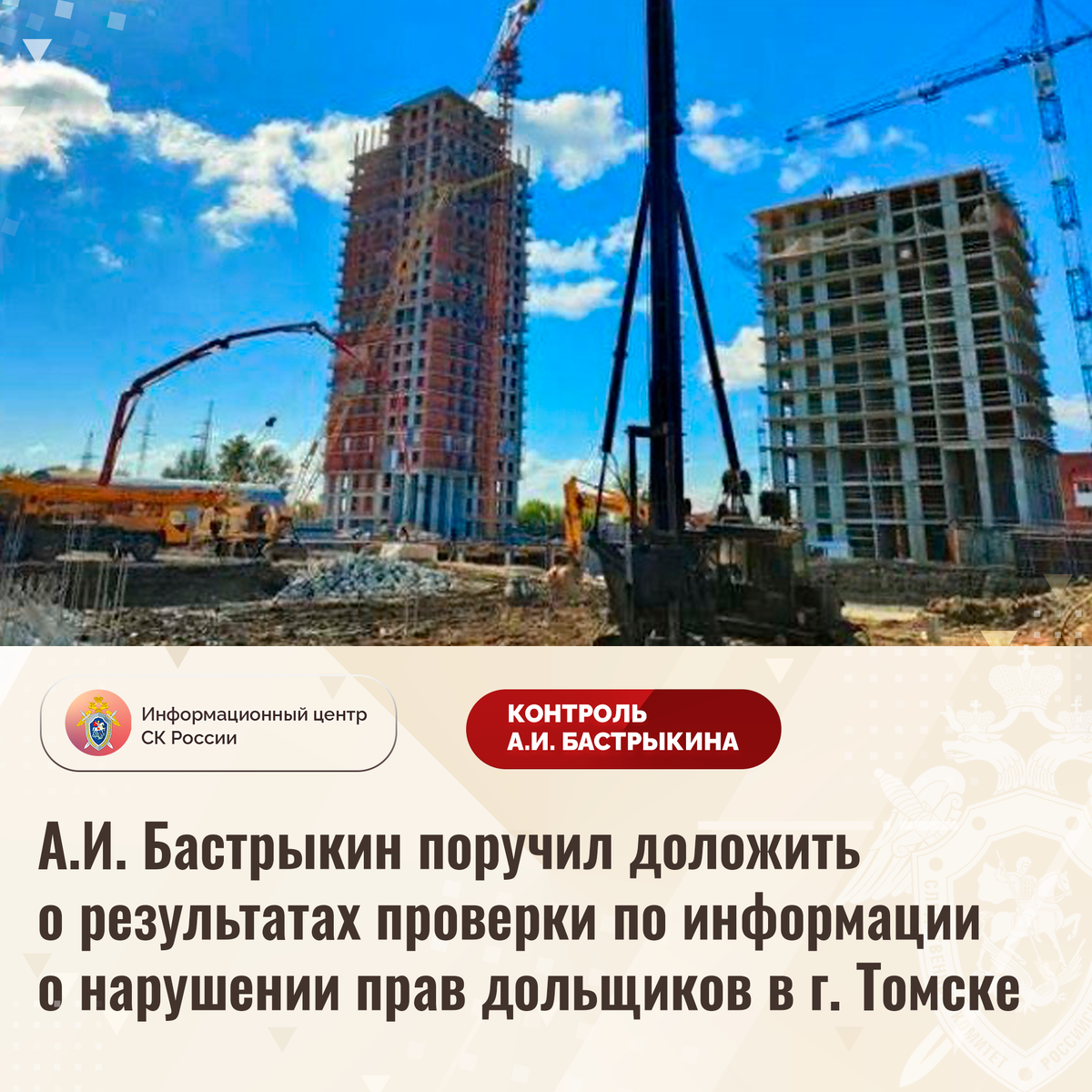 А.И. Бастрыкин поручил доложить о результатах проверки по информации о нарушении прав дольщиков в г. Томске
