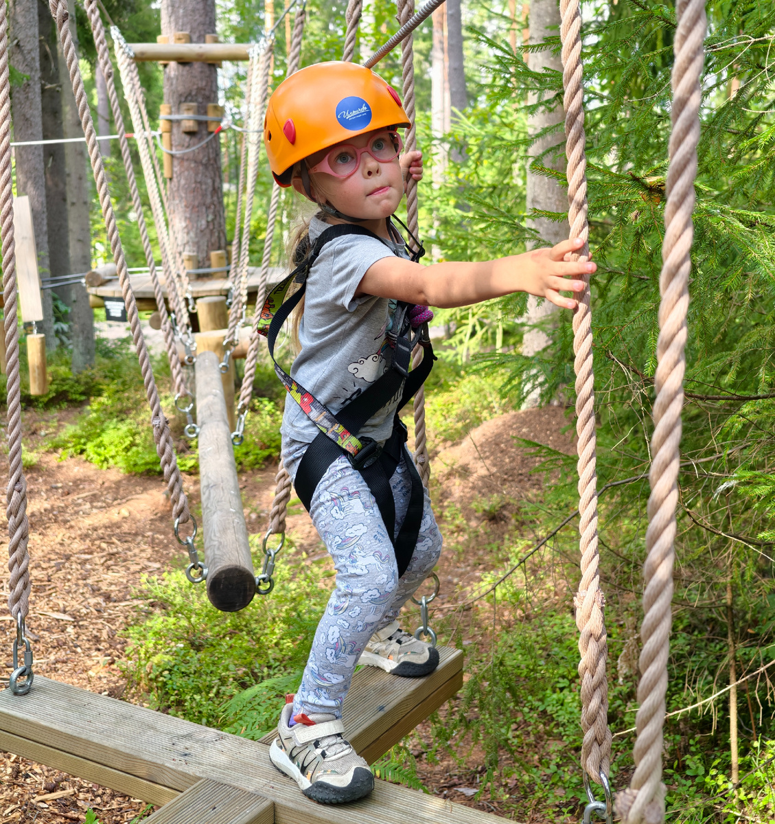 Сама малышковая трасса очень простенькая, проблем у дочки она не вызвала. Никаких пугающих ситуаций, как бывало, например, в парке на Изумрудном озере. Всего на ней, если мне не изменяет память, семь переходов, на фото как раз все и попали.