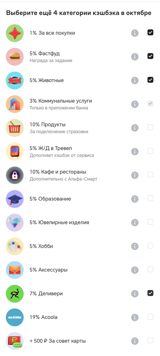 Сегодня от Альфа-Банка пришло уведомление, что пора выбирать кэш на Октябрь. Ну ок, надо так надо.