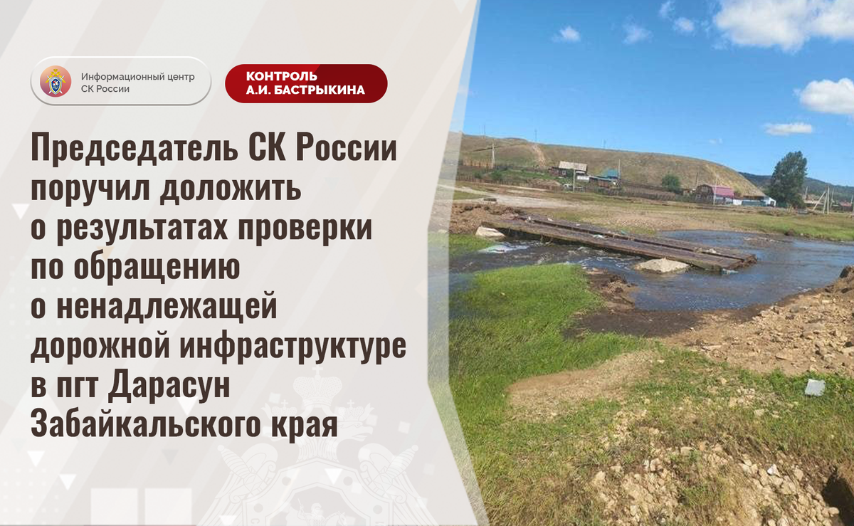 Председатель СК России поручил доложить о результатах проверки по обращению о ненадлежащей дорожной инфраструктуре в пгт Дарасун Забайкальского края К Председателю СК России А.И. Бастрыкину через Информационный центр поступило обращение по вопросу нарушения прав жителей поселка городского типа Дарасун Забайкальского края на качественную дорожную инфраструктуру. На протяжении длительного времени дороги в населенном пункте находятся в непригодном состоянии в связи с отсутствием асфальтового покрытия и образованием многочисленных повреждений на поверхностях. При этом в результате произошедшего в июле текущего года паводка грунтовые полотна и имевшиеся в населенном пункте мосты оказались разрушены, а единственная уцелевшая переправа расположена на значительном расстоянии от домовладений. Жители опасаются, что в случае возникновения чрезвычайных ситуаций сотрудники экстренных служб не смогут своевременно прибыть на вызов. Обращения в уполномоченные органы результатов не принесли, мер к орг