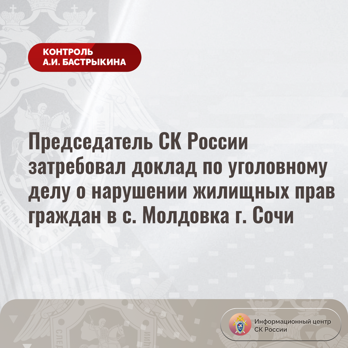 Председатель СК России затребовал доклад по уголовному делу о нарушении жилищных прав граждан в с. Молдовка г. Сочи