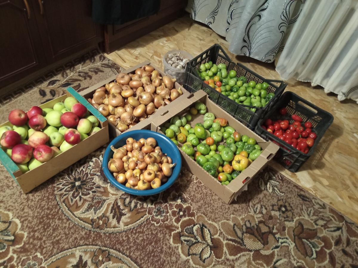 Обещают морозцы до минус 6, поэтому все затащила домой. Особо хранить негде, главное, подальше от батарей. Лук, помидоры, чеснок и яблоки - все мое богатство, которое хотелось бы подольше сохранить.