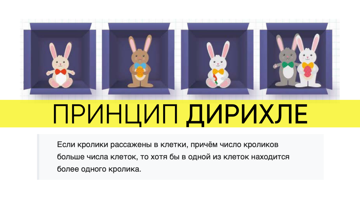 Друзья, привет! Сегодня разбираем ещё одну интересную и одновременно с этим полезную тему по математике - принцип Дирихле. Математики всего мира любят иллюстрировать принцип Дирихле на примере с кроликами и коробками. Мы также не будем отходить от этой традиции. Формулировка Предположим, что у нас есть m кроликов и n коробок, причём m > n ("m больше n"). Тогда верно следующее: если всех кроликов рассадить по коробкам, то обязательно найдётся хотя бы одна коробка, в которой окажется больше одного кролика. Наглядное доказательство Сначала рассадим по коробкам n кроликов - по одному в каждую. После этого останется m - n кроликов, которых нужно рассадить, причём m - n положительное число в силу условия. Так как все эти кролики должны быть размещены в тех же n коробках, нам придётся сажать их в уже занятые коробки. Значит, как минимум одна из коробок будет содержать двух или более кроликов. Менее очевидное применение На этом этапе вы можете подумать, что текущий принцип является очевидным.