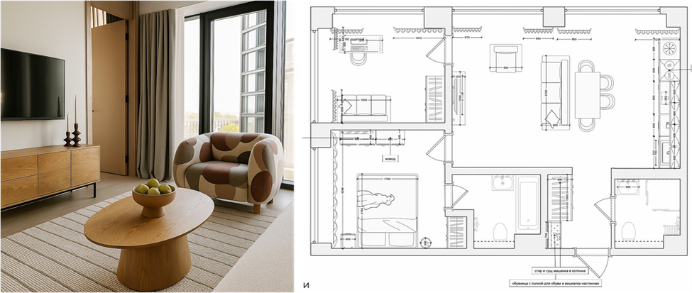 Мы подготовили дизайн-проект с визуализацией, обсудили детали с клиенткой и запустили в работу. Основой концепции стал стиль джапанди – сдержанный, но невероятно уютный сплав скандинавской практичности и японской философии простоты. Это не просто тренд, а образ жизни, где нет ничего лишнего, но каждая деталь продумана, и именно это отражает характер хозяйки квартиры – энергичной, рациональной, но при этом стремящейся к балансу и спокойствию.