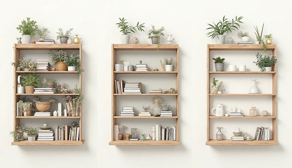 Формула идеальной полки: Высокий предмет (ваза, книги стопкой) + средний (фоторамка, свеча) + низкий (плоское блюдо, маленький горшок с растением)