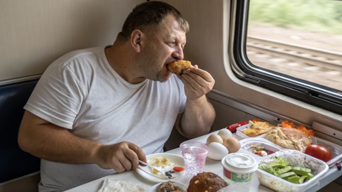 — Вы что, правил путешествия в поездах не знаете? — возмутился лысеющий попутчик. — Столик предназначен для всех пассажиров купе. Люди с верхних полок тоже имеют право нормально поесть.