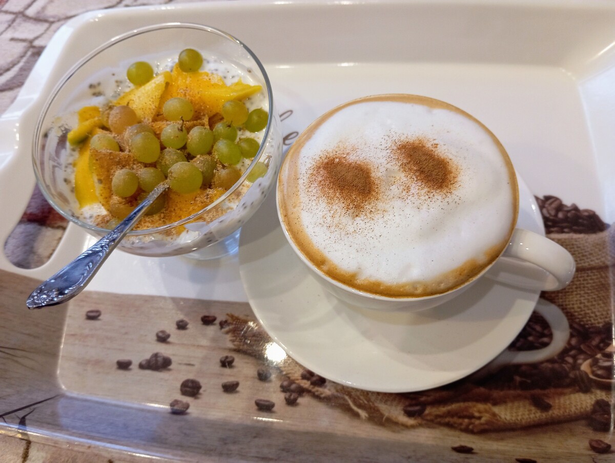 Утром перед работой я не очень хотела есть, накануне был поздний ужин. Поэтому обошлась кофе и своим любимым ацидофилином с семенами чиа, сверху манго, виноград и яблочная клетчатка. Вообще это блюдо довольно насыщенно нутриентами и сытное. Мне потом часа три есть не хочется.