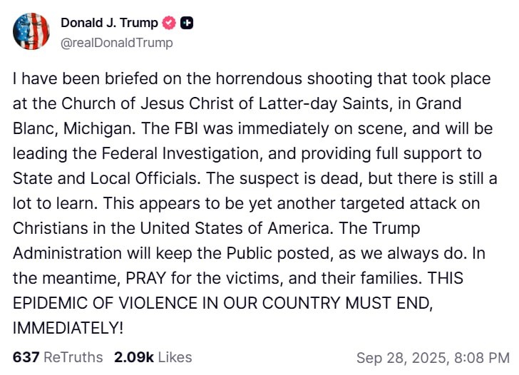 В ответ на пост 'Yet another targeted attack on Christians in US' — Trump condemns Mormon church attack in Michigan 'This epidemic of violence in our country must end, immediately!'