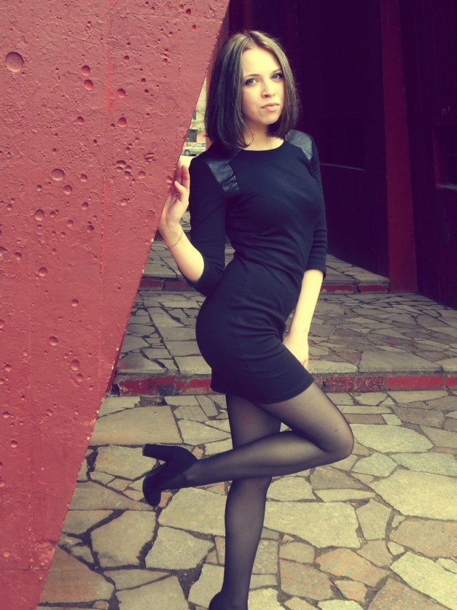 На фоне яркой, алой стены стоит молодая женщина, облачённая в элегантное чёрное платье, подчеркивающее её стройную фигуру. Её длинные ноги обрамлены изящными чёрными колготками, а в руках она уверенно держит позу, словно приглашая к разговору.