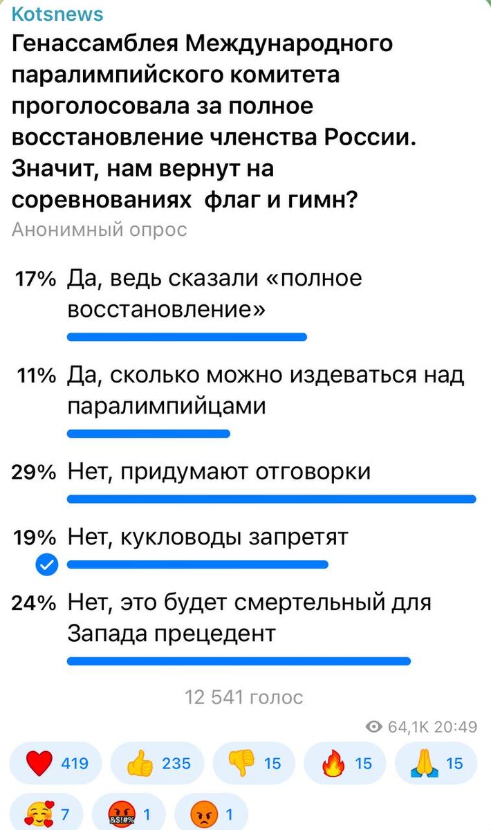 ⚡️⚡️⚡️ 29 процентов подписчиков считают, что чиновники от большого спорта всегда найдут «отмазку». Большая политика не пощадит даже паралимпийцев.