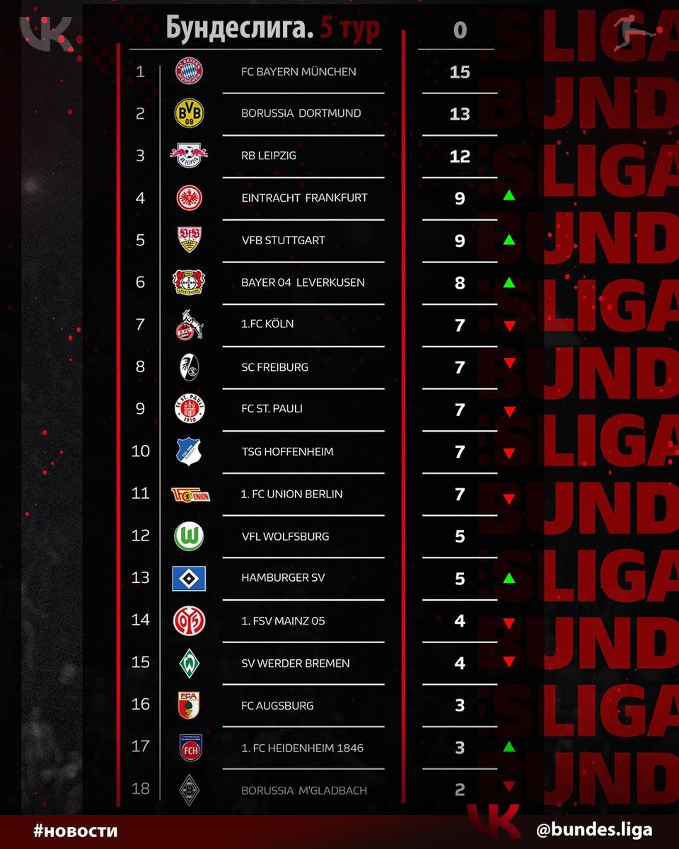 #Бундеслига 🇩🇪 Итоговая таблица и результаты матчей 🔥 - #Бавария - неоспоримо первая 💪 - #Дортмунд и #РБ - не отпускают чемпиона в отрыв 👊 - В топ-6 - #Айнтрахт, #Штутгарт и #Байер 😎 - С победой, #Хайденхайм! ✅ - #Гладбах и Айнтрахт - спасибо. Матч недели в Европе! 👏 ▶️ Хайлайты 4 тура vk.cc/cPVuDs (обновляется) 📺 Всё видео паблика здесь vk.cc/cMPlf7 🏆 Это Бундеслига, брат! #Бундеслига