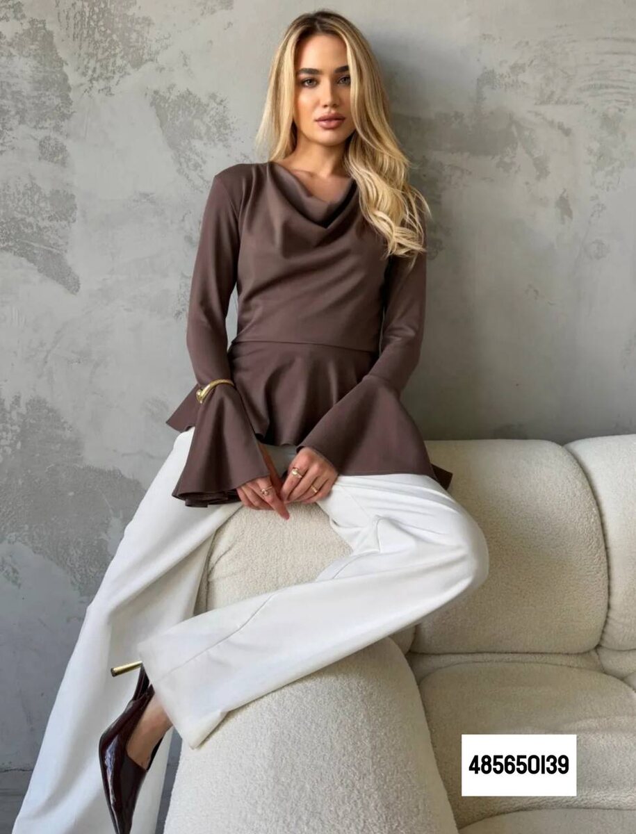 Элегантная блуза глубокого шоколадного оттенка с мягкой драпировкой у горловины создаёт ощущение струящейся ткани и визуально удлиняет шею. Линия талии подчеркнута аккуратной баской, которая формирует женственный силуэт песочных часов и маскирует линию живота. Рукава расширяются к низу — лёгкий намёк на стиль семидесятых, который всегда смотрится благородно.