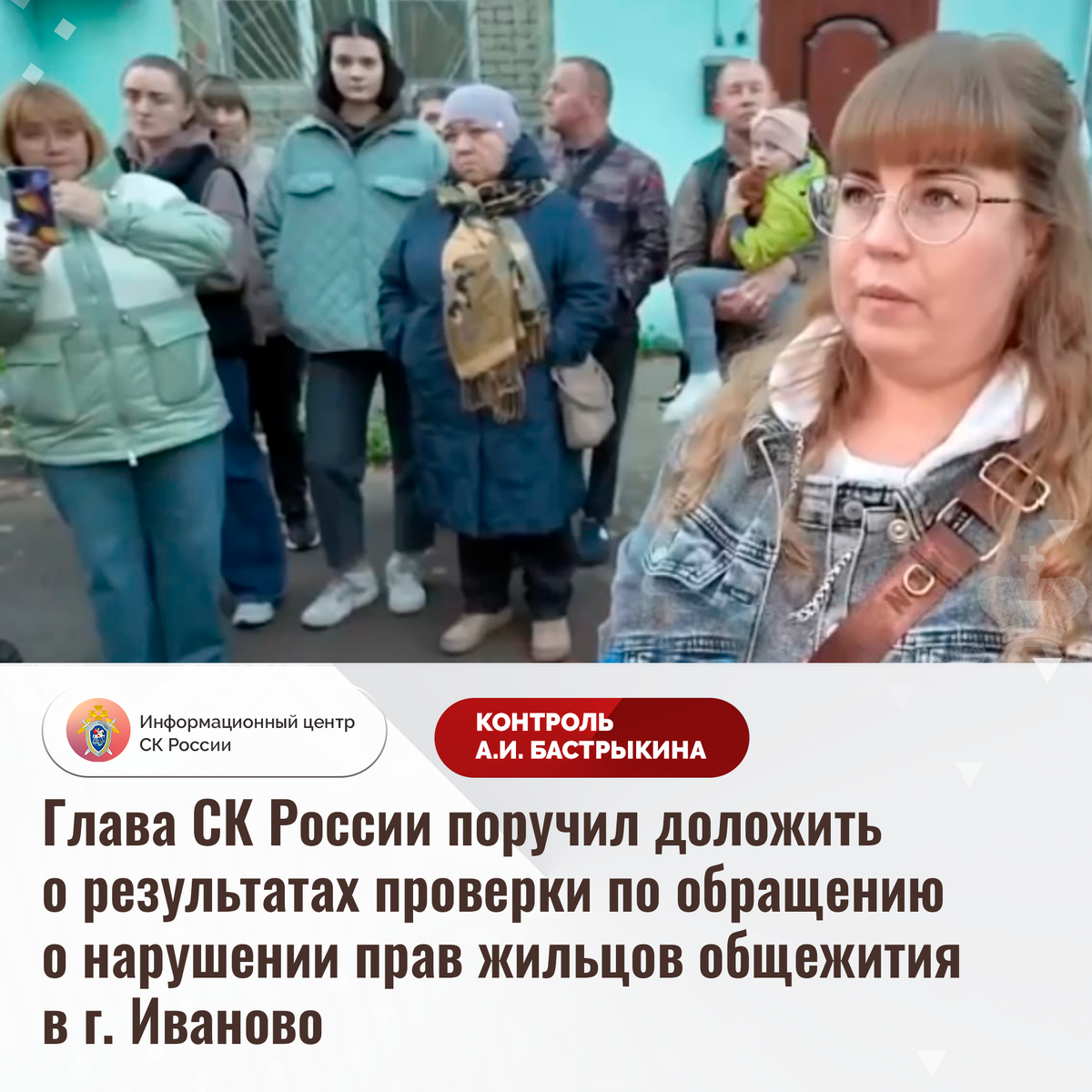 Глава СК России поручил доложить о результатах проверки по обращению о нарушении прав жильцов общежития в г. Иваново В комментариях в социальной сети СК России опубликовано обращение по вопросу нарушения прав жильцов общежития на улице Сакко города Иваново. В сентябре текущего года в здании 1917 года постройки произошел пожар, в результате которого конструкции оказались повреждены, а часть жилых помещений полностью уничтожена. В настоящее время пострадавшим предлагается переселение в дома, расположенные на значительном расстоянии от прежнего места жительства и находящиеся в непригодном состоянии. Указанная ситуация освещалась в СМИ. В СУ СК России по Ивановской области начата процессуальная проверка. Председатель Следственного комитета Российской Федерации Александр Иванович Бастрыкин поручил руководителю СУ СК России по Ивановской области Дмитрию Аркадьевичу Позовскому доложить о промежуточных результатах процессуальной проверки и принятом по итогам решении. Исполнение поручения, а т