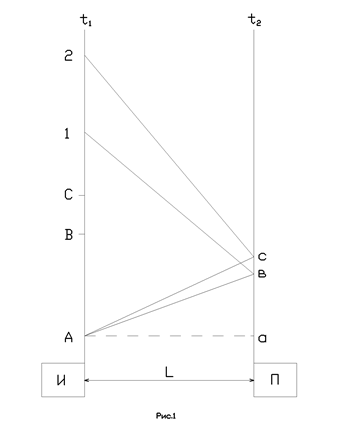 Предлагаю эксперимент, который позволит измерить одностороннюю скорость света, ну и, попутно синхронизировать часы. Эксперимент основан на постоянстве коэффициента уменьшения скорости света в различных средах, например, в оптоволокне по отношению к скорости света в вакууме. Рассмотрим источник «И» и приёмник-отражатель «П» световых импульсов, размещённых на расстоянии L друг от друга. (Рис.1) Источник и приёмник-отражатель имеют часы, ход времени которых отображён на осях t1 и t2. Время на часах не синхронизировано, но синхронизирован ход часов. То есть, время на часах не совпадает, но если на одних часах прошла ровно одна секунда, то и на других пройдёт ровно одна секунда. Источник в момент времени А выдаёт два световых импульса в сторону приёмника и принимает отражённые импульсы. Один из импульсов проходит свой путь в вакууме, другой в некой среде, например, в оптоволокне. Импульс, прошедший в вакууме, пройдёт путь несколько быстрее. Его путь изображён как А – в – 1. Путь импульса в