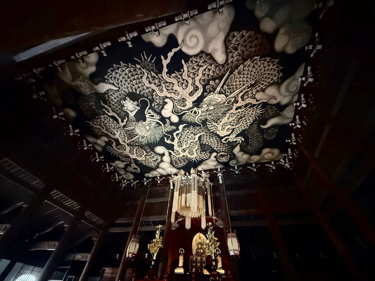 Дракон символизирует защиту и духовную силу. В дзэн-буддийской традиции дракон считается хранителем, оберегающим храм от пожаров и приносящим «дождь мудрости». Изображение двух драконов на потолке воплощает идею гармонии противоположностей — инь и янь, света и тьмы, мужского и женского начал. Это напоминание о равновесии, к которому стремится человек в поисках внутреннего дзена.