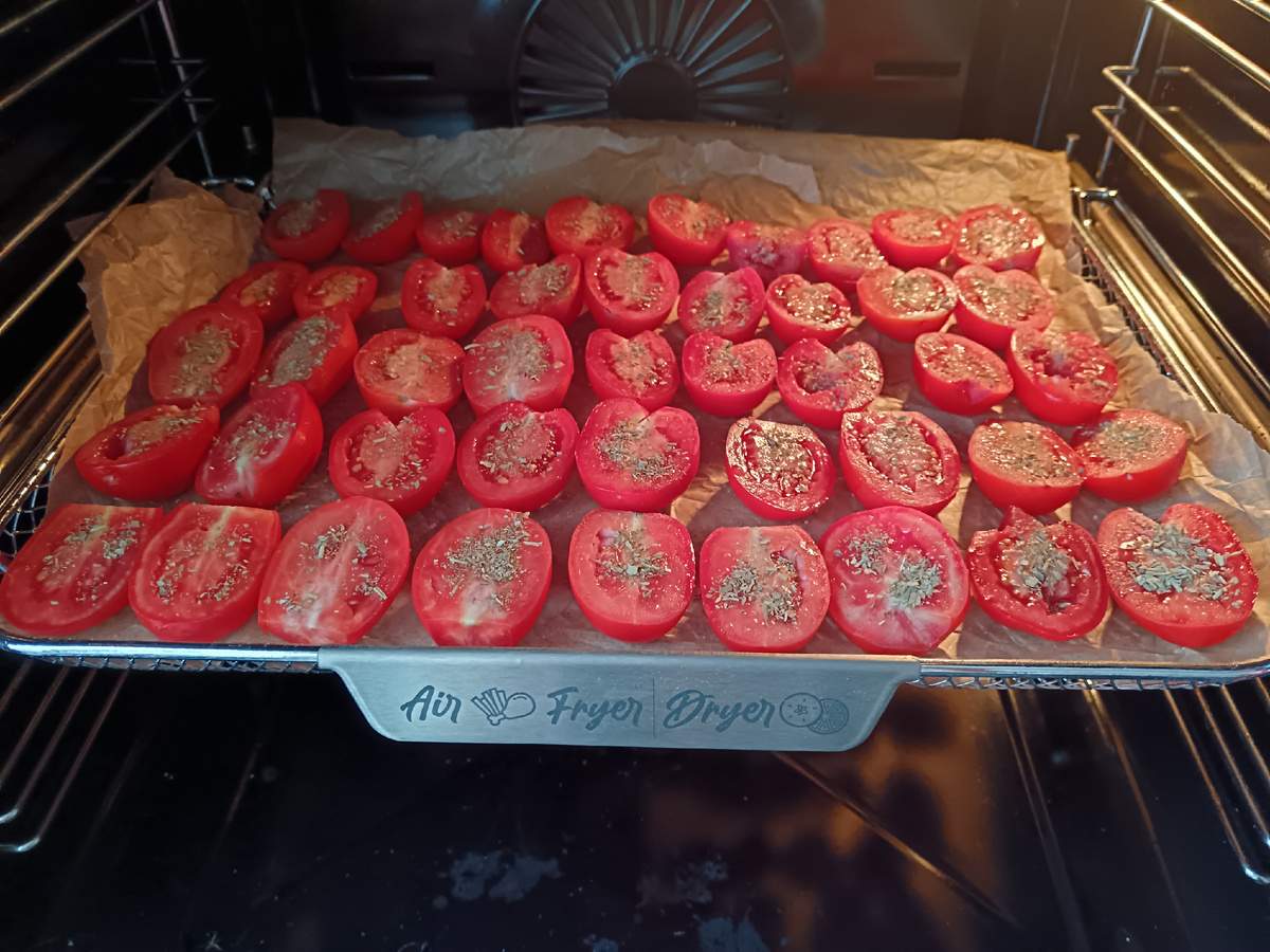 Всем привет! Вяленые Томаты - это что-то из эксклюзивного, Итальянского) и в магазине стоят достаточно дорого. Но зачем покупать в магазине, когда можно завялить помидоры самостоятельно, при чём достаточно легко?! Существует два домашних способа завялить помидоры дома, это в духовке и в электросушилке. Какой же способом лучше и удобнее? 1. Способ в электросушилке. Помидоры сливки разрезаем на пополам и выкладываем вверх мякотью на протвини сушилки, присыпаем слегка солью, сахаром и прованскими травами. Так заполняем каждый противень и включаем на нужным режим. Я обычно ставлю на ночь, а утром противни меняю местами, потому что снизу сушитсч больше, чем сверху. И оставляю еще часов на 5-6. 2. Способ в духовке На противень или если есть сетка кладем бумагу для выпечки. Выкладываем помидоры и также посыпаем солью, сахаром и прованскими травами. Ставим духовку на 90 градусов часов на 6-8 (всё зависит от духовки. Каким бы образом бы вы не вялили помидоры, надо упаковать всё в ба