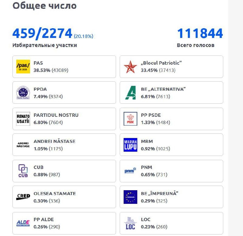 Партия Санду PAS вышла вперед на парламентских выборах в Молдавии, по данным обработки 20% бюллетеней UPD: Оппозиционные партии Молдавии набрали 49,54% на участках внутри страны, опережая правящую партию «Действие и солидарность», у которой 44,13%, свидетельствуют данные ЦИК после подсчета 100% протоколов с участков. Тем не менее, партия Санду заняла первое место на выборах. Кто бы сомневался… 👍 БайБайден. Подписаться