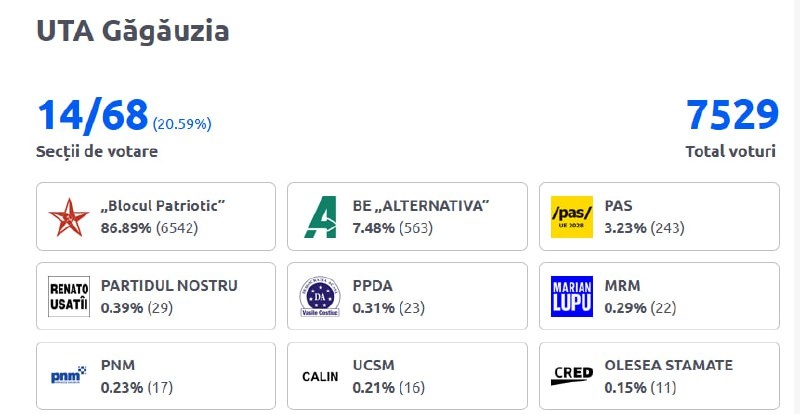 With 20% of votes counted, Gagauzia supports the Patriotic Bloc with CRUSHING 86