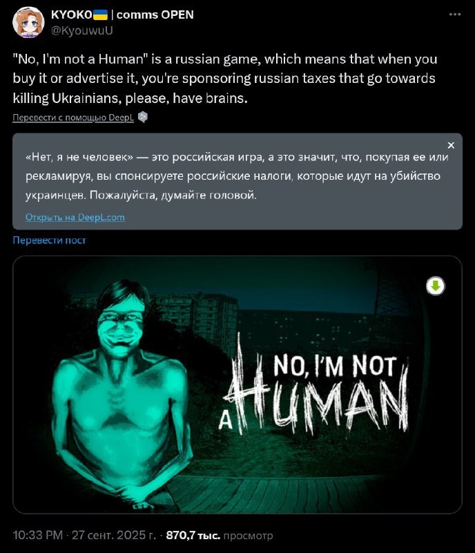 Украинские пользователи объявили бойкот русскому хоррору No, I'm not a Human. Причина проста: по их словам, каждая покупка игры — это «донат на убийство украинцев», ведь проект сделан российскими разработчиками. Но реальность такая: всего за 4 дня после релиза игра разлетелась тиражом в 100 тысяч копий и уже собрала 86% положительных отзывов в Steam. Хейт в сети и продажи в плюс — классика индустрии. Их бойкот, а разработчикам — хайп. Подробнее: https://hard-tm.su/threads/118099/ 🕹HARD-TM — Подписаться