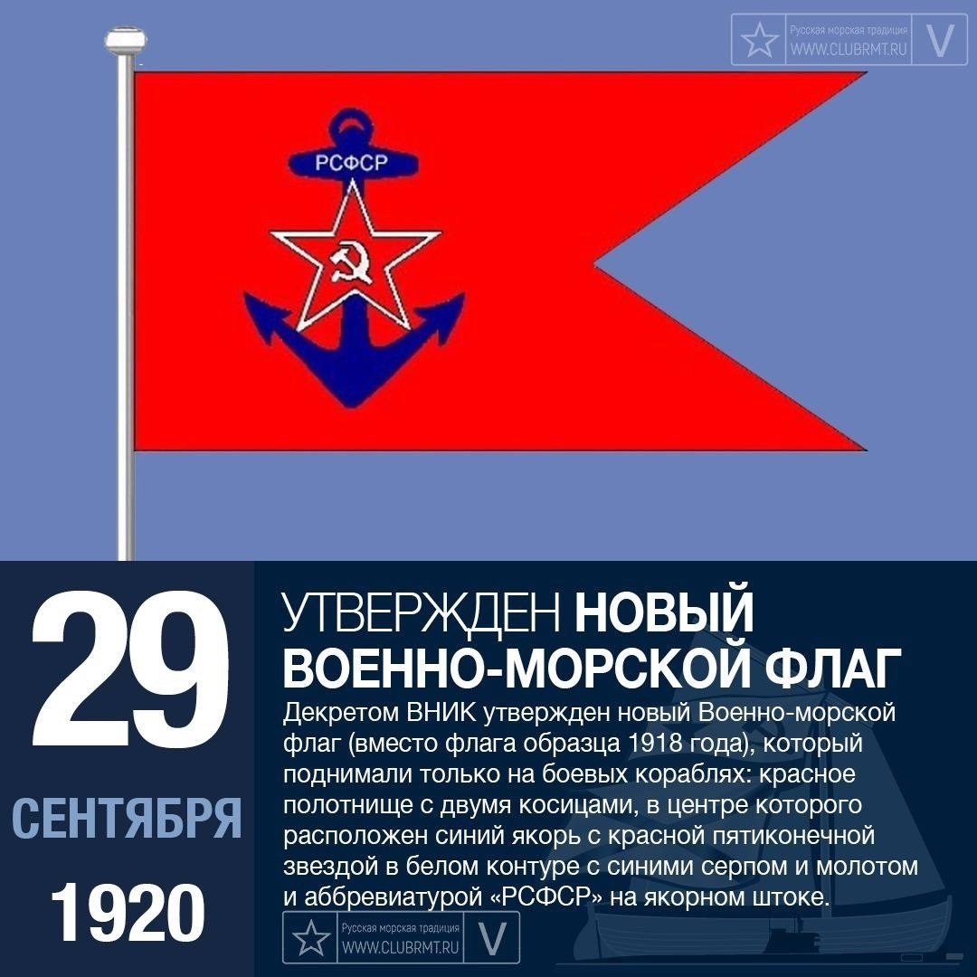Откорректированная версия публикации о событиях этого дня в отечественной морской истории: 29 сентября - этот день в отечественной морской истории. 80 лет – 1945, 29 сентября: Скончался Архиепископ Александр (в миру Анатолий Михайлович Толстопятов), епископ Русской православной церкви, архиепископ Молотовский и Соликамский. 105 лет – 1920, 29 сентября: Декретом ВНИК утвержден новый Военно-морской флаг (вместо флага образца 1918 года), который поднимали только на боевых кораблях: красное полотнище с двумя косицами, в центре которого расположен синий якорь с красной пятиконечной звездой в белом контуре с синими серпом и молотом и аббревиатурой «РСФСР» на якорном штоке. Действующие корабли, кроме того, поднимали вымпелы - красные, узкие, склоненные к концу полотнища с двумя косицами. 115 лет - 1910, 29 сентября (16 сентября по старому стилю): Первый дипломированный военный летчик России лейтенант С.Ф. Дорожинский совершил в районе Севастополя первый в истории Российской морской авиации по