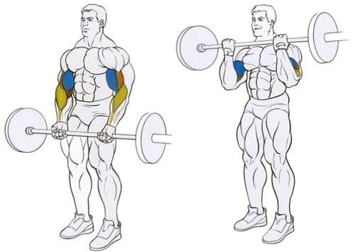 Движение: одновременно делать выдох и поднимать штангу вверх до груди, сгибая руки в локтевых суставах. Сделать небольшую паузу в верхней точке. На выдохе медленно и подконтрольно опускать штангу в нижнюю точку, разгибая руки в локтях.