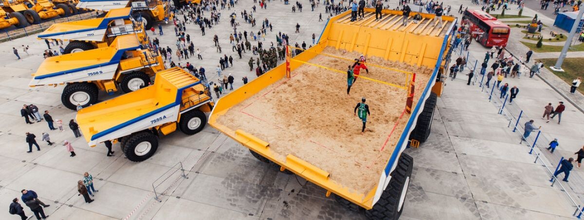 В Республике Беларусь в рамках празднования Дня Машиностроителя прошёл выставочный шоу - матч с участием звёзд пляжного волейбола. Серебряный призёр Чемпионата России, обнинский волейболист Дмитрий Веретюк в паре с призёром Олимпийских игр Вячеславом Красильниковым сыграли против Александра Дедкова и Павла Петрушко - чемпионов Республики Беларусь. Для этого матча в кузов самого большого карьерного самосвала в мире загрузили почти 400 тонн песка; матч проходил на высоте третьего этажа. Мероприятие состоялось на территории завода «БелАЗ» в городе Жодино. Помимо игроков, судьи и фотографы также были доставлены на песчаный корт в самосвале при помощи подъёмника. В самом матче победила дружба: первую партию выиграл Дмитрий Веретюк и Вячеслав Красильников - 21:19, а вторая с таким же счётом осталась за Александром Дедковым и Павлом Петрушко. После матча Дмитрий Веретюк поделился своими впечатлениями. Он рассказал, что для него это невероятный опыт и он испытывает гордость от участия в этом м