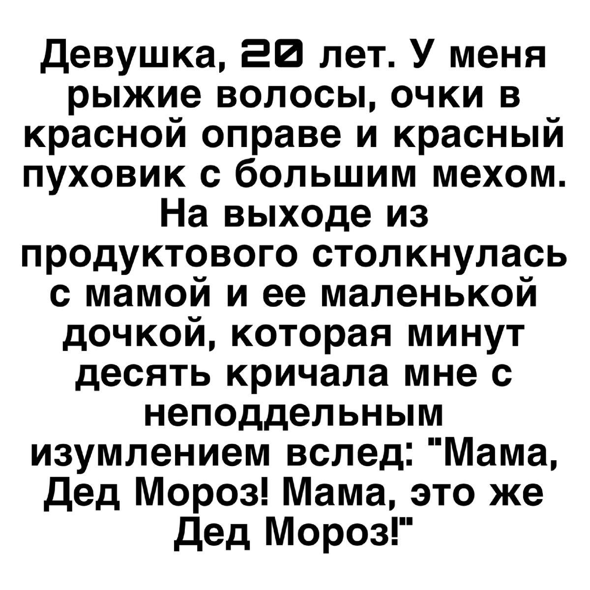 Девушка, 20 лет. У меня рыжие волосы, очки в красной оправе и красный пуховик с большим мехом. На выходе из продуктового столкнулась с мамой и ее маленькой дочкой, которая минут десять кричала мне с неподдельным изумлением вслед: "Мама, Дед Мороз! Мама, это же Дед Мороз!"
