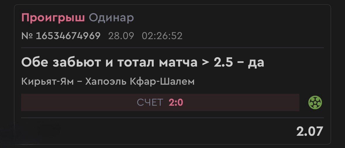 В ответ на пост Иногда предварительные цифры врут. Вернее, не врут, а сталкиваются с реальностью 😄 Хапоэль Кфар-Шалем, забивавший в 4 матчах кряду в обоих таймах, в этот раз выдал статистику - 0 ударов в створ. Ноль, Карл! 😆 Добавьте 54% владения мячом и 41 опасную атаку. С такой эффективностью гостей ни о каком ОЗ не могло быть и речи 🤷♀️ Хотя бы на ютубе сегодня все зашло на изи (в отличии от вчера - вечер сюрпризов) вообще абсолютно все, что забирал, как на заказ! И это отлично, не зря старался!
