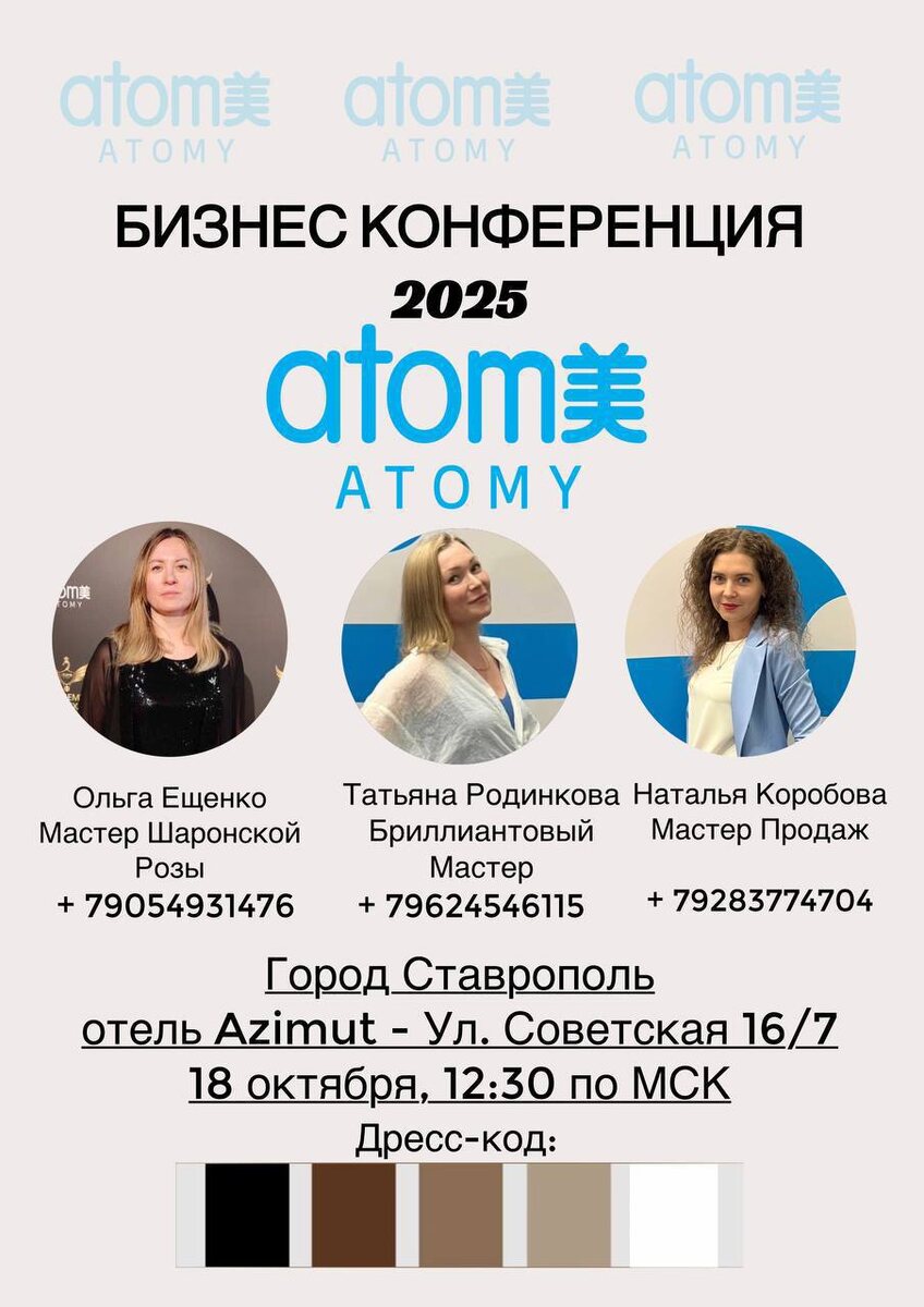 🔥Главное событие этой осени в Ставрополе!🔥 📆 18 октября ⏰ собираемся в 12:30 по МСК 🗺️Отель Azimut - Ставрополь, ул. Советская 16/1 *⚡️КОНФЕРЕНЦИЯ АТОМИ⚡️* Это больше чем просто встреча! Это взрыв энергии, мотивации и новых возможностей🌎 Это твой шанс: - вдохновиться и выйти на новый уровень 🏆 - ощутить силу сообщества💪 - выиграть классные призы в нашей лотереи🎁 Яркие, харизматичные спикеры будут делиться своим видением бизнеса , результатами от применения продукции и драгоценным опытом🤩 А так же тебя ждет командная фотосессия📸 и уютный кофе-брейк ☕️ После конференции ты точно поймешь, как выйти на стабильный доход от 100 000₽ с Атоми💵 *И ПУСТЬ ЭТА ОСЕНЬ СТАНЕТ МОЩНЫМ ПРОРЫВОМ🚀* Вход - 500 ₽ *Количество мест ограничено. Пиши мне в личное сообщение и забронируй участие уже сейчас и встретимся на волне успеха и роста🔥
