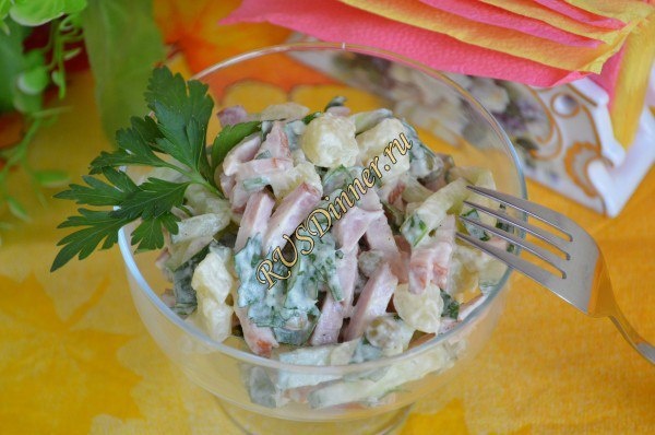 Салат с картофелем, карбонатом и горошком От автора: Салат с картофелем, карбонатом и горошком простой и вкусный салатик, вроде бы обычные ингредиенты, но замечательный вкус. Ингредиенты: Картофель - 250 гр. Карбонат - 210 гр. Горох консервированный - 1 б. (маленькая) Огурцы свежие - 210 гр. Петрушка - 1 пуч. (хватит 0,5 пучка) Соль - 3 гр. Перец черный молотый - 2 гр. Майонез - 75 гр. Источник: https://rusdinner.ru/page/salat-s-kartofelem-karbonatom-i-goroshkom