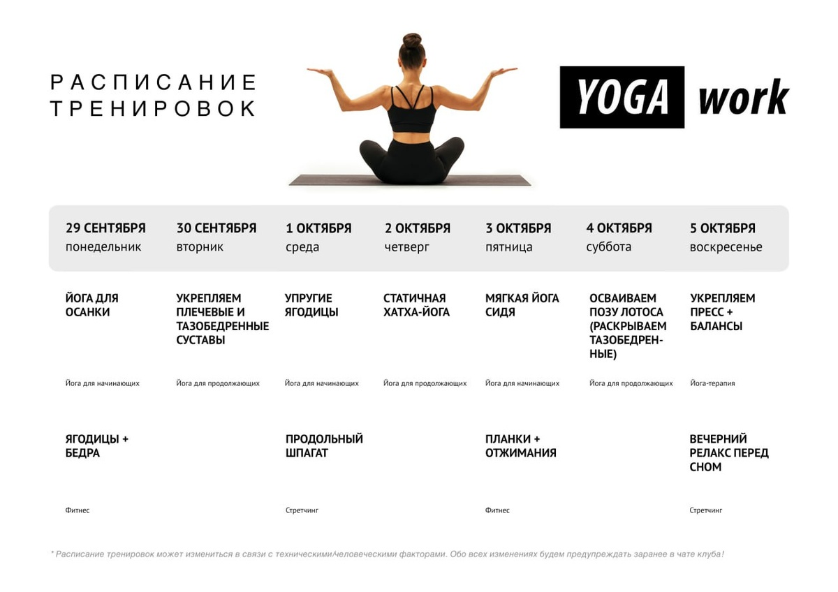 😅 Кажется, неделя только началась — а сил уже ноль? Спокойно! Мы всё предусмотрели С 29 сентября по 5 октября вас ждёт расписание, где каждый день — маленький подарок телу: где-то сила, где-то лёгкость, где-то релакс ❤️ Понедельник — йога для осанки + фитнес для ягодиц и бёдер Начинаем неделю с расправленной спины и гордой осанки. А фитнес-блок поможет подтянуть ноги и ягодицы — то самое сочетание, которое делает тело утонченным. ❤️ Вторник — укрепляем плечевые и тазобедренные суставы Йога для суставов — это профилактика боли и скованности в теле. ❤️ Среда — упругие ягодицы + продольный шпагат Тренировка, после которой джинсы садятся идеально! Сильные ягодицы — это не только эстетика, но и защита поясницы. А продольный шпагат сделает тазобедренные суставы более подвижными. ❤️ Четверг — статичная хатха-йога Здесь мы учимся останавливаться: задерживаться в асанах, слушать дыхание и чувствовать тело глубже. Практика для силы, выносливости и внутреннего равновесия. ❤️ Пятница — мягк