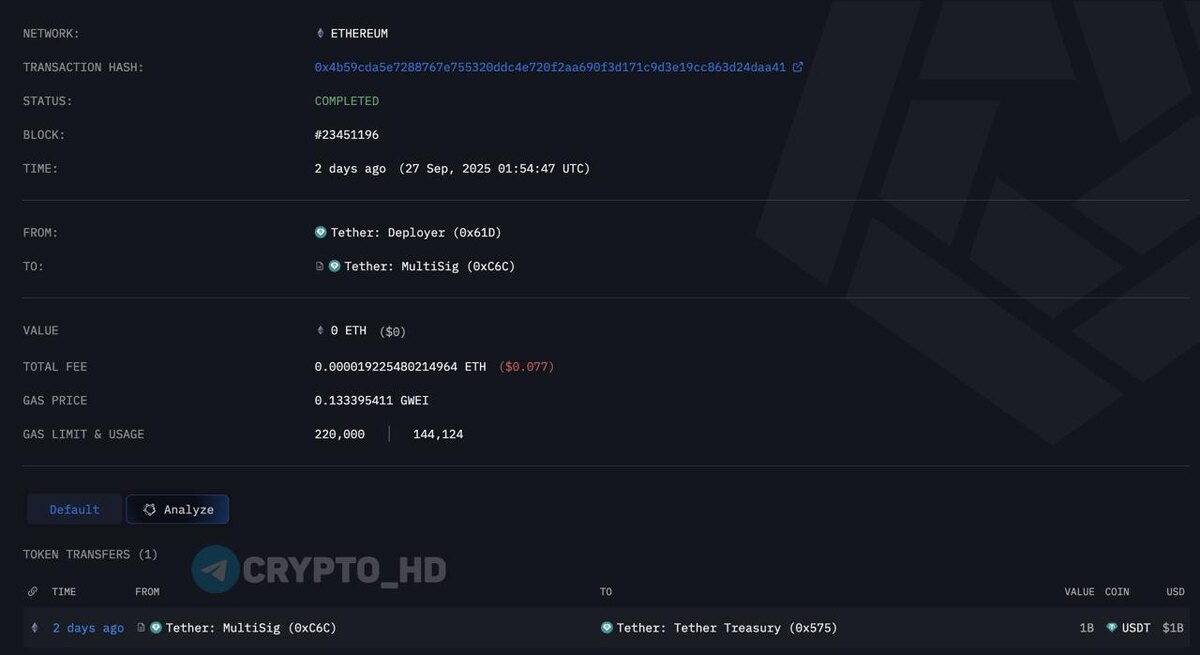 🖨 Arkham: В Tether на выходных напечатали очередной 1,000,000,000 USDT. Crypto Headlines
