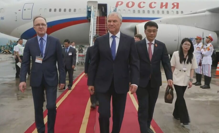 Председатель Государственной думы РФ Вячеслав Володин в воскресенье прибыл в Ханой по приглашению главы Национального собрания Вьетнама Чан Тхань Мана. На кадрах политик спускается по трапу и обменивается рукопожатиями с членами встречающей делегации. Ранее в социальной сети MAX Володин сообщил, что примет участие в 4-м заседании Межпарламентской комиссии по сотрудничеству между Госдумой России и Национальным собранием Вьетнама. Стороны обсудят развитие двусторонних торгово-экономических связей и инвестиционный климат, укрепление контактов в области энергетики, роль парламентов в построении справедливого безопасного мира и другие вопросы. Также в программе визита запланированы встречи с руководством республики.
