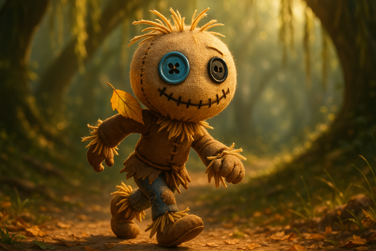 На краю старого кукурузного поля, на высоком шесте, стояло Пугало. Его сшил старый фермер из мешковины, набил свежей соломой и одел в свою потрёпанную рубаху и шляпу. Вместо глаз у него были две разномастные пуговицы — одна синяя, как летнее небо, другая чёрная, как земля. А рот ему был вышит кривой, но весёлой улыбкой.