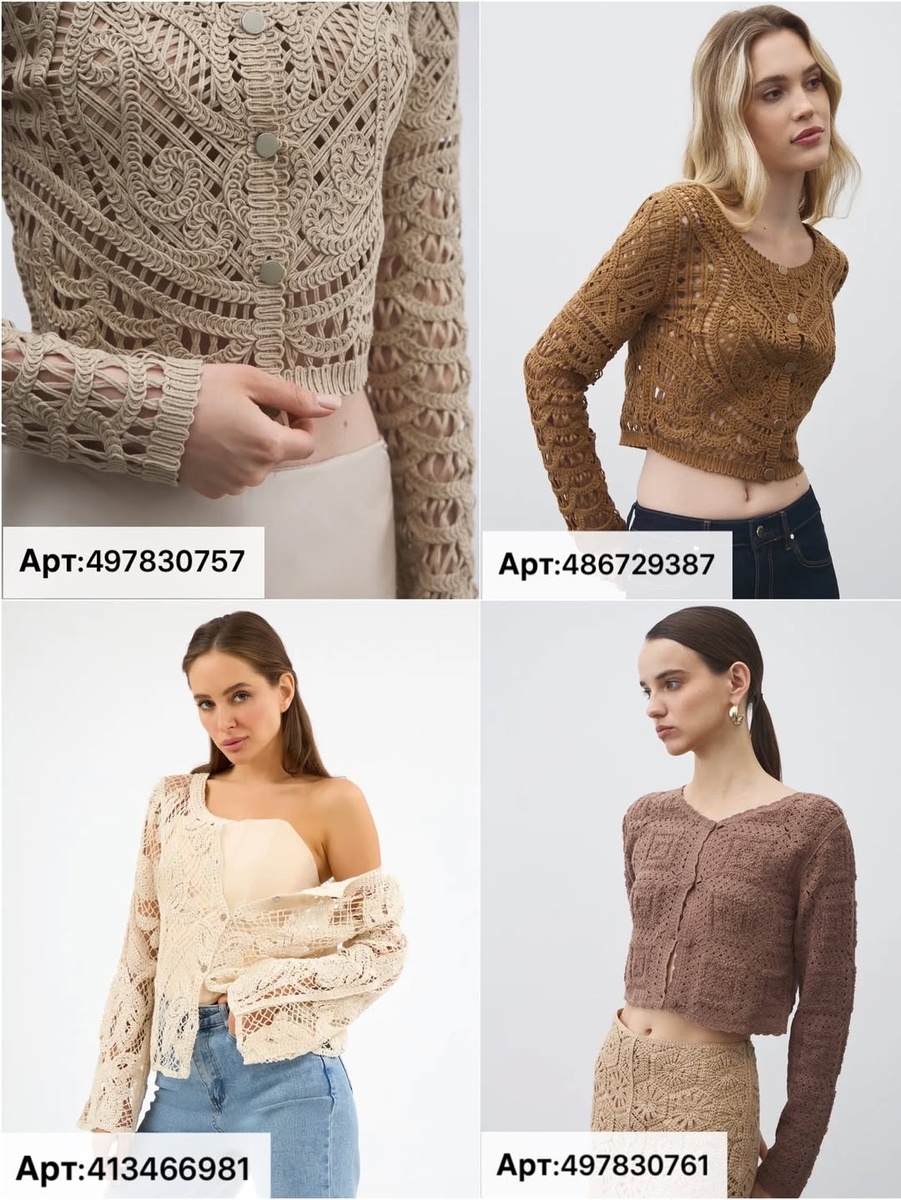 1) Арт. 497830757 — бежевый ажурный кардиган с фактурной застёжкой