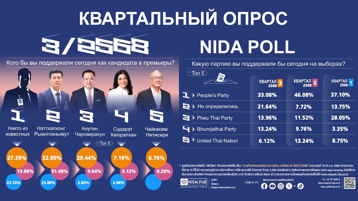 People's Patry продолжает возглавлять рейтинг самых популярных в Таиланде Политическая сделка с Анутином Чарнвиракуном и формирование правительства под его руководством нанесли удар по поддержке People's Party и ее лидера Наттхапхонга Рынгпаньявута тайскими избирателями, однако «оранжевые» по-прежнему остаются самой популярной политической силой в стране. Это следует из квартального отчета социологическокй службы Национального института администрирования развития (NIDA Poll). Данные опроса NIDA за III квартал были опубликованы 28 сентября, и самые популярные ответы на вопрос о подходящем премьере – либо господин Рыангпьянвут, либо никто из известных политиков. Правда, теперь уже с перевесом в пользу «кандидата против всех», а не лидера оппозиции. Впрочем, главный признак стабилизации политического поля – исчезновение из топ-5 вероятных премьеров Праюта Чан-Очи. О генерале, руководившим правительством в течение девяти лет после отстранения им Йинглак Чинавата в 2014 году, снова загов