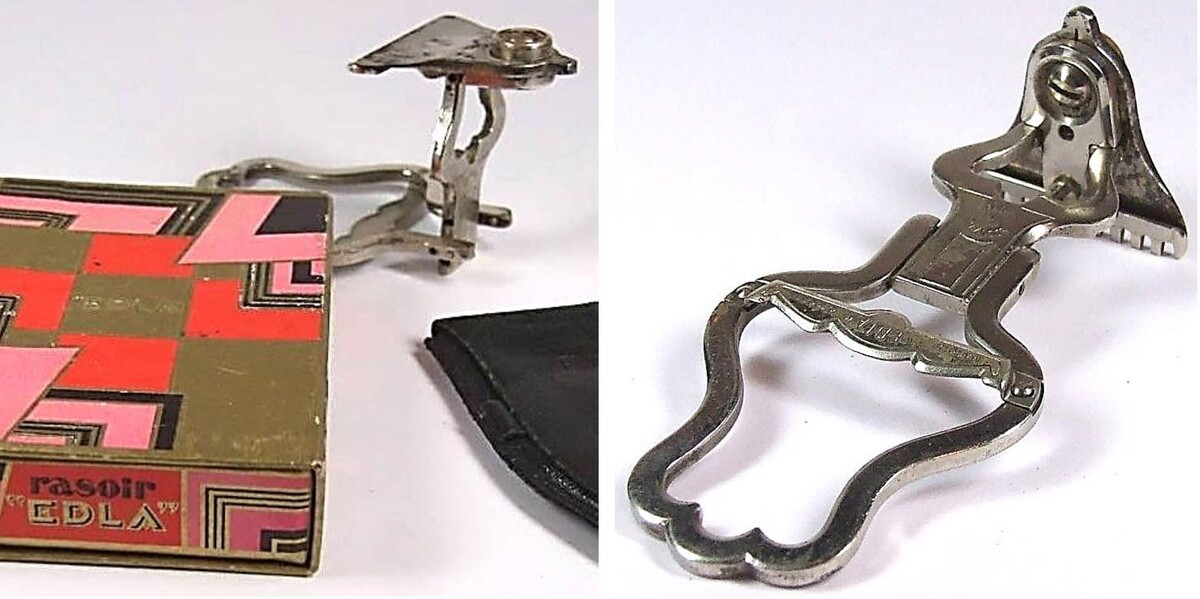 Красивый бритвенный аппарат "Edla" изобретателя Мари-Луи Ривера, конец 1920-х. Выпускался во Франции в двух вариантах комплектации. С традиционной ручкой станка и без, как на изображении выше.