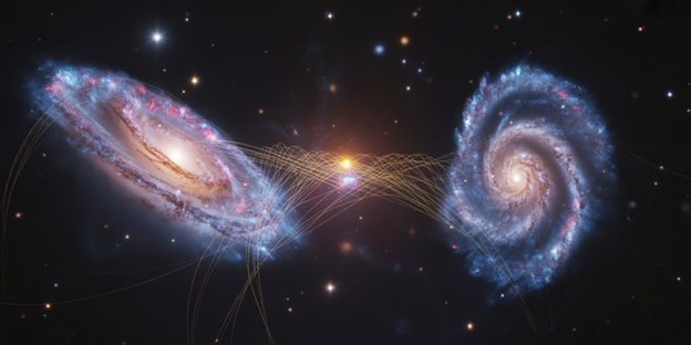 А теперь давайте перейдем к самому сочному — галактической запутанности. Представьте: две галактики, разделенные миллионами световых лет, могут находиться в состоянии квантовой запутанности. Движение звезд в одной мгновенно коррелирует с движением звезд в другой, без всякой видимой причины.