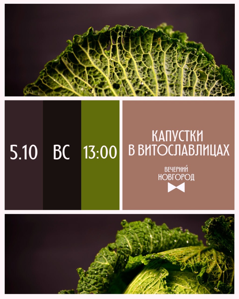 🍃 Новгородцев и гостей города приглашают на традиционный этнографический праздник «Капустки» — это старинный русский осенний обычай коллективной заготовки капусты на зиму, который совмещает практическую необходимость и весёлые народные гулянья. В программе: — секреты приготовления традиционных щей — «овощное рукомесло» — рубка крошева и капусты «помочью» — показ архаичного способа квашения капусты — загадки из кадки — народные игры и забавы 🗓 5 октября с 13:00 до 15:00 📍 Музей народного деревянного зодчества «Витославлицы» 🎟 Билеты можно приобрести в кассе в день праздника или онлайн Для детей до 5 лет, инвалидов I и II группы, многодетных семей (при предъявлении удостоверения) — вход бесплатный